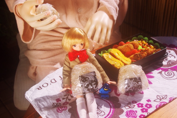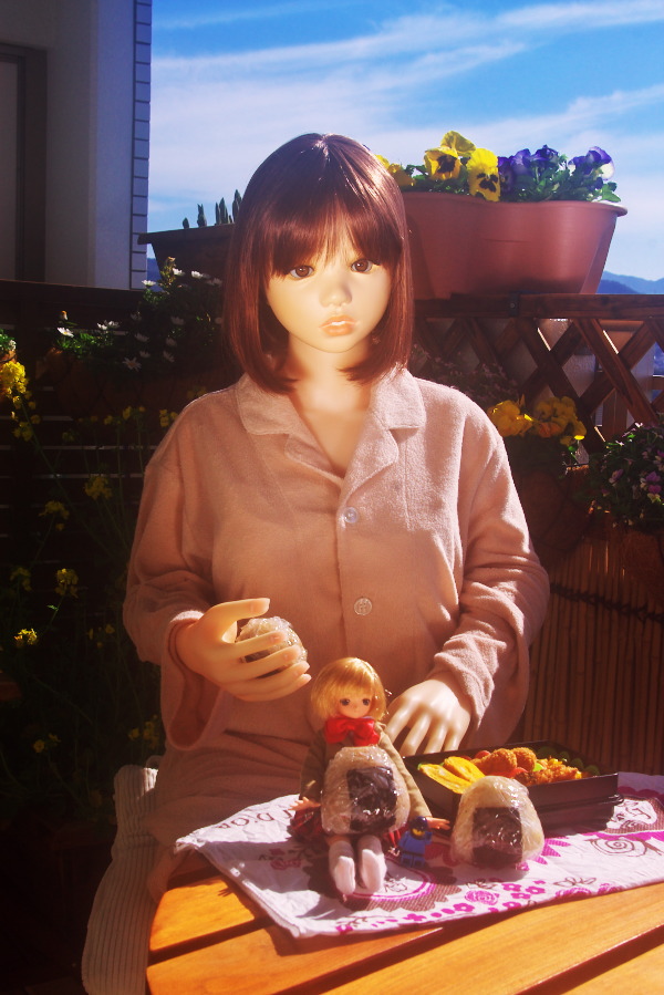 | 今日はお天気が良いのでベランダでお昼ご飯のようです。 「カレーおにぎり作ったよ〜 「もも、おにぎり初めて♪ 「菜の花♪ |