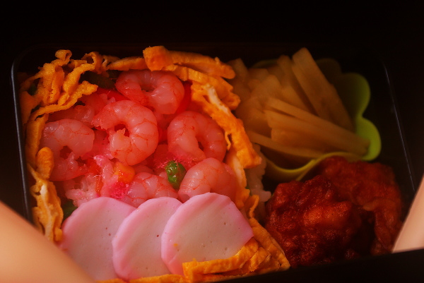 「えびがぷりぷり〜♪ 「てんぷらも好き? お料理のお話しだと少し会話が続くようです。お姫様が お弁当に気をとられている間に潜入作戦でしょうか。 |