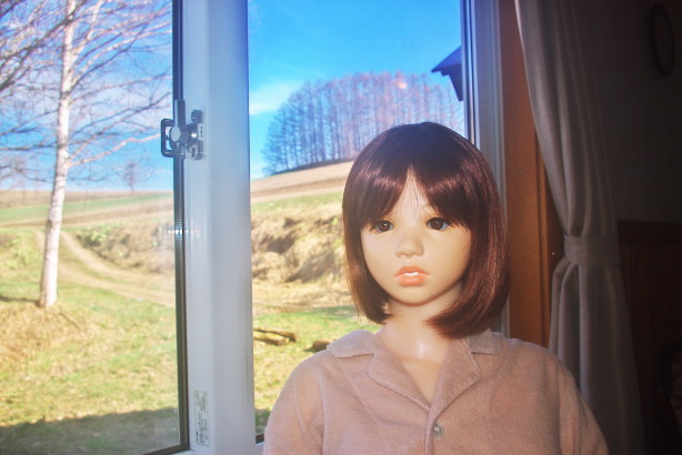 お日様が昇っていくのを眺めるすみれさん、コテージからは一面に広がる じゃがいも畑が見渡せます。空が澄んでいて風が心地よいです。 |